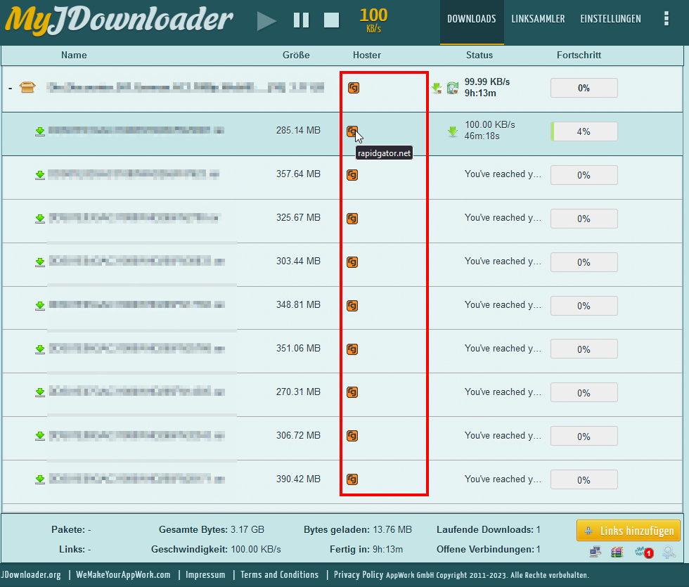 Die Webseite zum steuern auf https://my.jdownloader.org/ zeigt dir ja nur an in wie weit die downloads erreichbar sind auch durch die Icons. Also ich würde fast daruf tippen das die Downloads recht alt sind und hier nicht mehr alle zur Verfügung stehen.